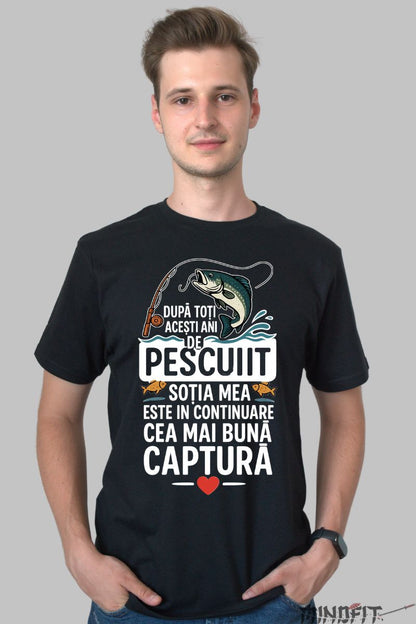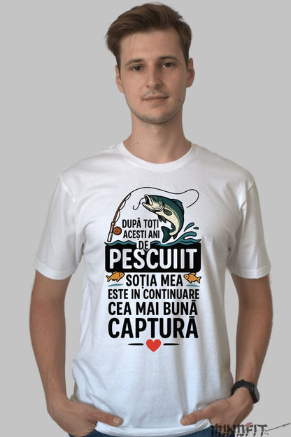Pentru pescarii care isi pastreaza simtul umorului si dragostea pentru partenera, acest tricou este alegerea ideala. Cu mesajul „Dupa toti acesti ani de pescuit, sotia mea este in continuare cea mai buna captura”, modelul combina perfect pasiunea pentru pescuit cu glumele despre viata de cuplu.
