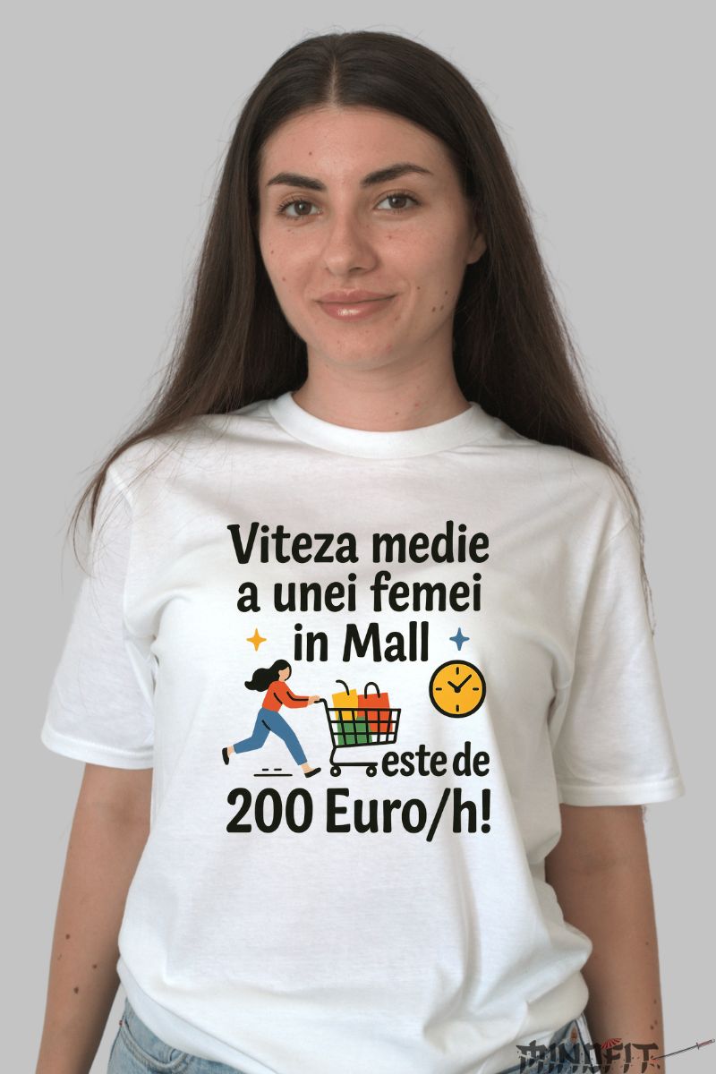 Daca ai simtul umorului si iti place sa porti mesaje haioase, acest tricou este alegerea potrivita! Designul include mesajul "Viteza medie a unei femei in Mall este de 200Euro/h!", o gluma simpatica ce va atrage cu siguranta zambete. Perfect pentru un stil casual cu personalitate.