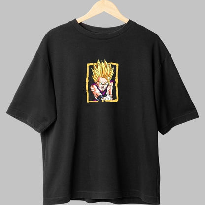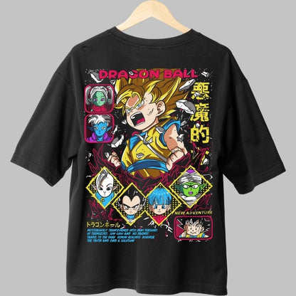 Designul colorat il pune in prim-plan pe Goten in forma Super Saiyan, inconjurat de personaje clasice ca Vegeta, Trunks, Piccolo sau Supreme Kai. Este o explozie vizuala care aduce energia universului Dragon Ball direct pe tricoul tau.