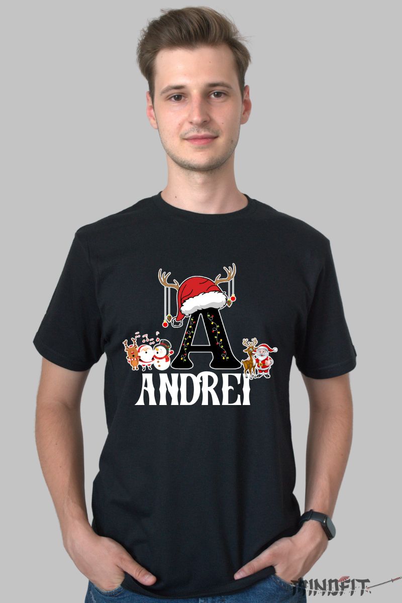 Daca vrei un tricou care iese imediat in evidenta, acest model cu initiala numelui si elemente de Craciun este alegerea ideala. Designul vesel, cu Mos Craciun, reni si decoratiuni, transforma orice nume intr-un moment magic si personal. Este perfect pentru poze, petreceri si atmosfera de sarbatoare.