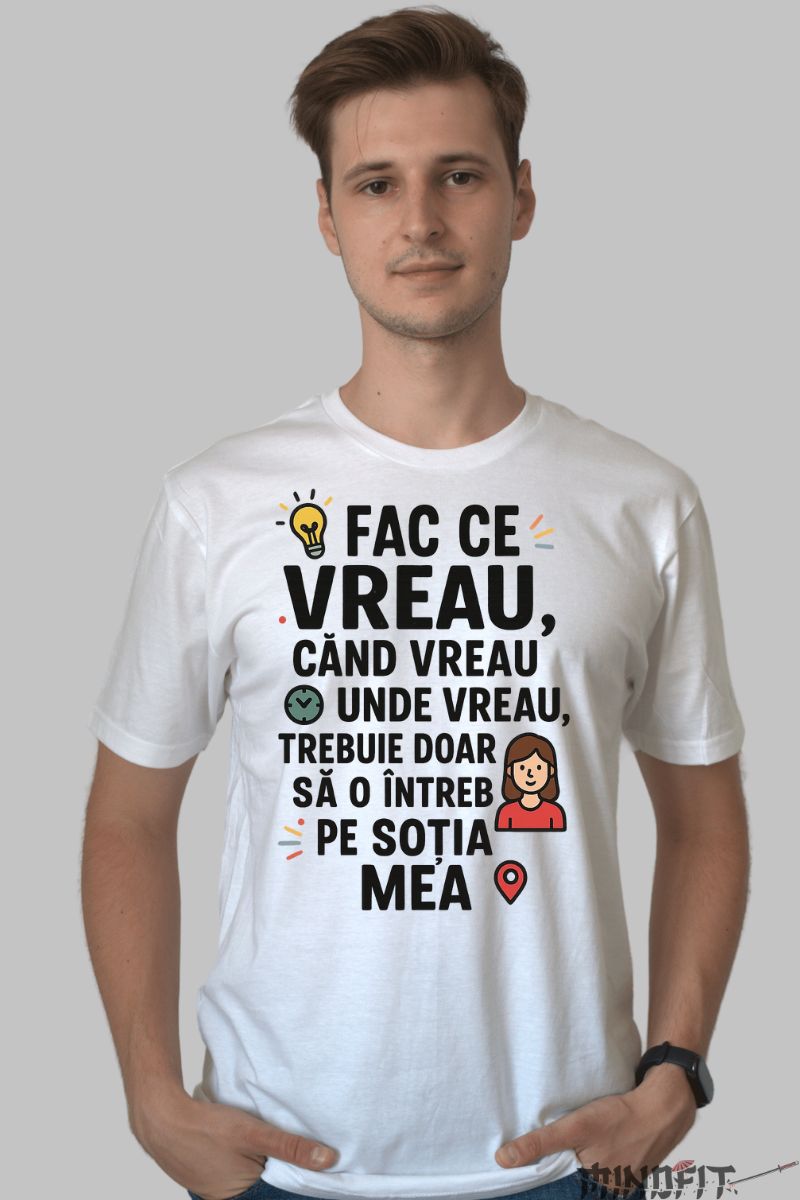 Daca iti place sa faci haz de dinamica mariajului, acest tricou este perfect pentru tine. Cu mesajul „Fac ce vreau, cand vreau, unde vreau – trebuie doar sa o intreb pe sotia mea”, tricoul imbina perfect sarcasmul cu realitatea vietii de cuplu. Un model amuzant care va atrage cu siguranta zambete si replici.