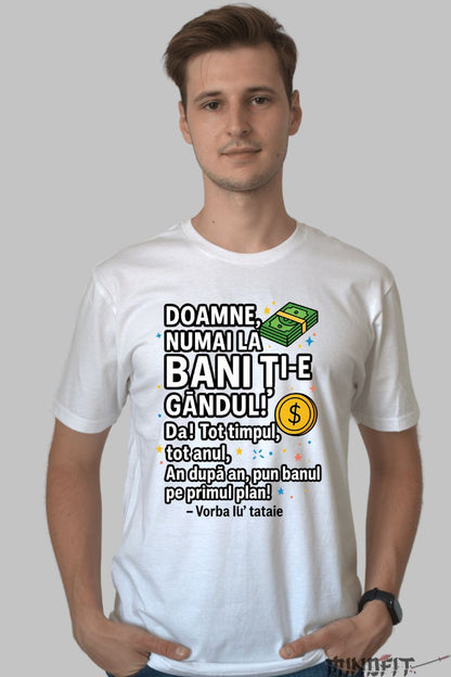 Tricoul cu textul „Doamne numai la bani ti-e gandul! Da! Tot timpul, tot anul, an dupa an, pun banul pe primul plan! Vorba lu' tataie” este perfect pentru cei care apreciaza umorul autentic, cu note de intelepciune populara si ironie fina. Un model care sigur va starni zambete, ideal pentru cei care iau viata cu haz.