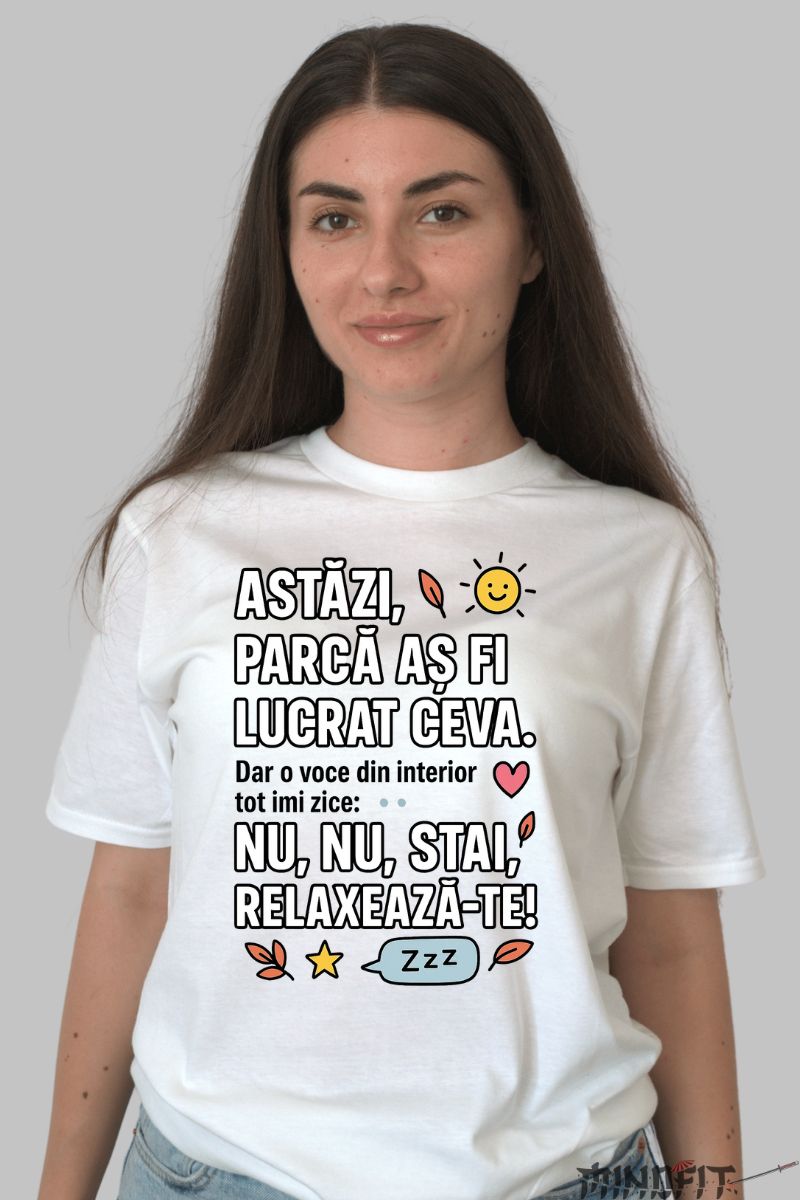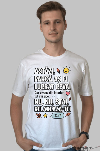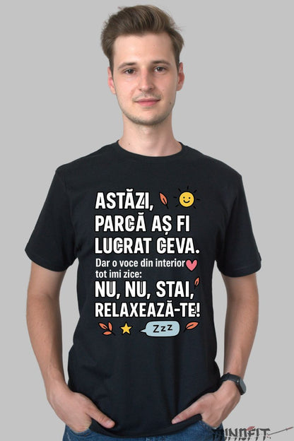 Ti se intampla sa ai o urma de energie, dar vocea interioara iti spune sa nu exagerezi? Atunci acest tricou cu mesajul „astazi parca as fi lucrat ceva. dar o vorba din interior tot imi zice: nu, nu stai relaxeaza-te!” e creat exact pentru tine! O alegere ideala pentru cei care apreciaza umorul subtil si autoironia.