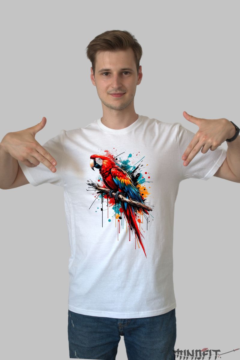 Acest tricou este alegerea ideala pentru cei care iubesc culorile si stilul indraznet! Designul prezinta un papagal multicolor, predominant rosu, cu detalii vibrante care transmit energie si buna dispozitie. Perfect pentru un look casual cu personalitate.
