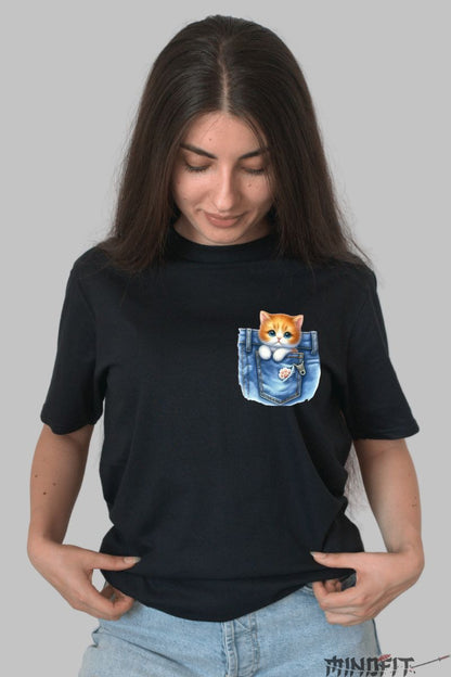 Daca iubesti pisicile si stilul casual, acest tricou este perfect pentru tine! Designul prezinta o pisica micuta si draguta care iese dintr-un buzunar de jeans, creand un efect vizual simpatic si jucaus. Perfect pentru orice tinuta lejera, acest model adauga un strop de personalitate garderobei tale.