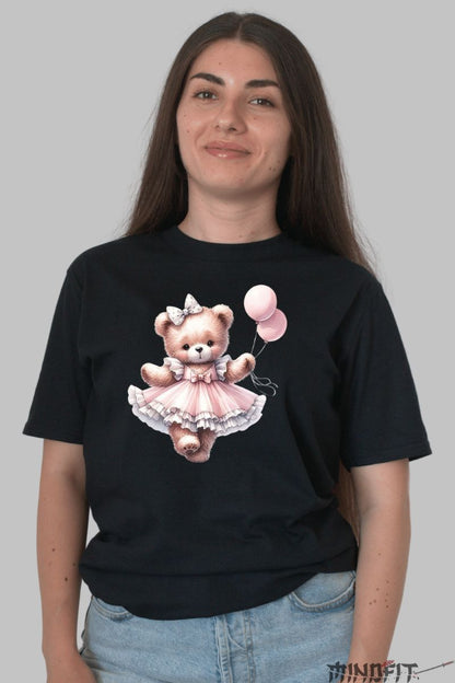 Acest tricou este alegerea perfecta pentru un look vesel si feminin! Ilustratia infatiseaza un ursulet roz adorabil, cu fundita, rochita si baloane – toate in nuante de roz, pentru un design armonios si plin de gingasie. Un model ideal pentru cadouri, tinute lejere sau zile in care vrei sa adaugi un strop de bucurie in outfitul tau.