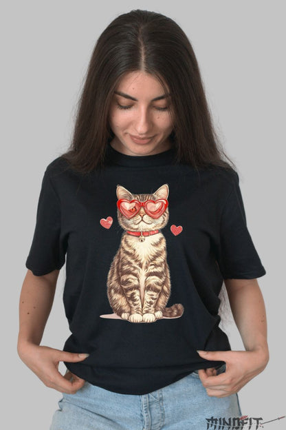 Adauga un plus de stil garderobei tale cu acest tricou cu pisica si ochelari in forma de inima! Designul jucaus si elementele retro il fac perfect pentru iubitoarele de pisici si moda vintage. Inconjurata de inimioare rosii, pisica din imprimeu aduce un aer chic si adorabil oricarei tinute.