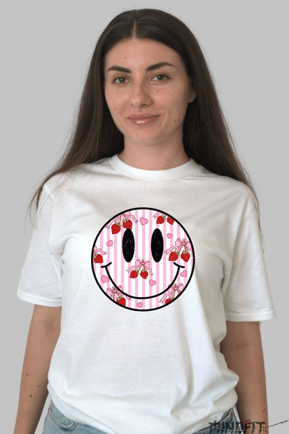 Poarta buna dispozitie cu tine cu acest tricou de vara cu design adorabil! Smiley face-ul vesel este decorat cu dungi roz si alb, capsune si inimioare, creand un look proaspat, jucaus si plin de energie pozitiva.