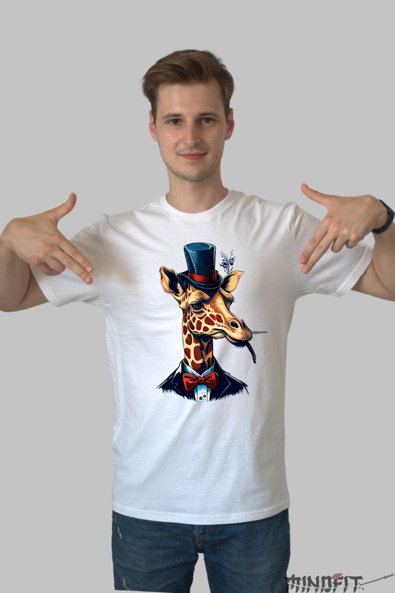 Acest tricou surprinde perfect contrastul dintre amuzant si sofisticat. Girafa eleganta, cu joben, papion si costum, este un personaj memorabil care adauga originalitate oricarei tinute. Ideal pentru cei care apreciaza detalii inedite si un strop de umor.