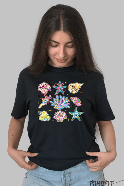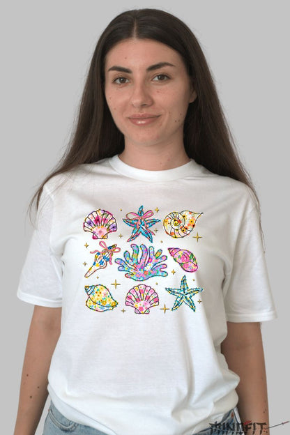 Adu vibe-ul de vacanta direct in tinuta ta cu acest tricou de vara decorat cu scoici viu colorate! Designul este compus din trei randuri de scoici diferite, cate trei pe fiecare rand, in nuante calde si jucause, inspirate de mare si soare.