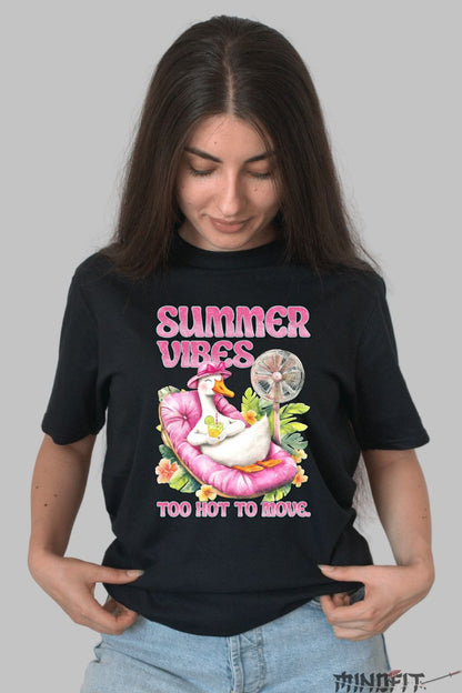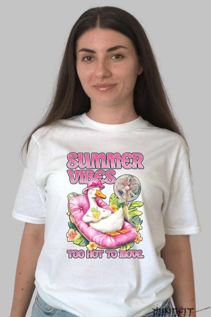 Exprima perfect starea de vara cu acest tricou haios si colorat! Designul include o rata cool relaxata pe o saltea gonflabila, inconjurata de frunze tropicale si cu un ventilator alaturi. Mesajul "Summer Vibes – Too Hot To Move" completeaza perfect vibe-ul estival si lenes al zilelor toride.